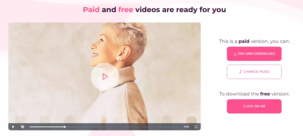 For important events, choose the paid version. Want to download a free one (with simpler effects)? There is a “click on me” button waiting for you. It is also possible to replace the music (or upload your own). That’s all. Your file is downloading.