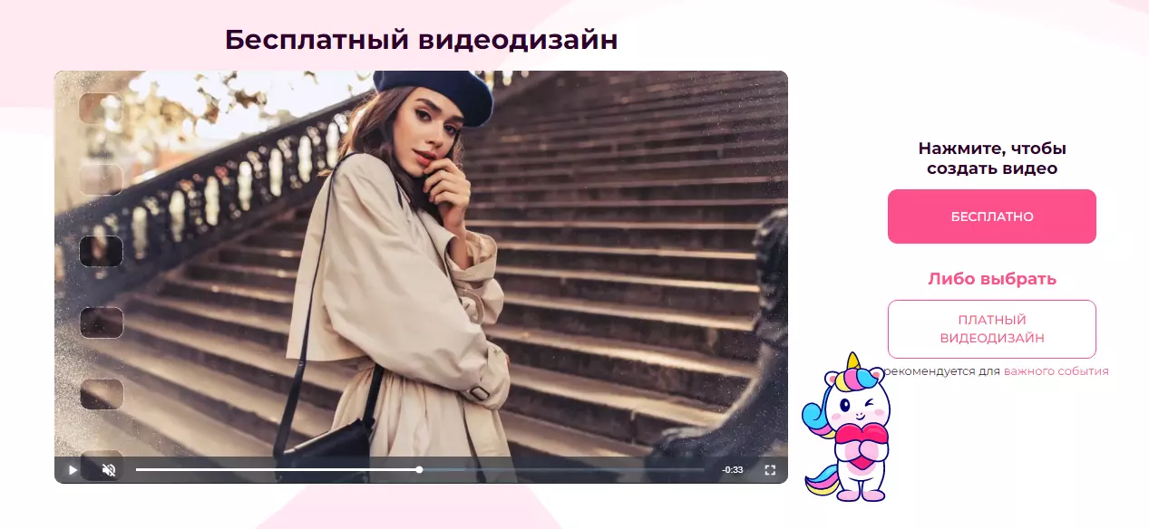 If the clip is for an important event, choose the paid version. To download a free video with simpler effects, press “click me”. If the music is not to your liking, you can replace it or upload your own. That’s all. Your beautiful slideshow is downloading.