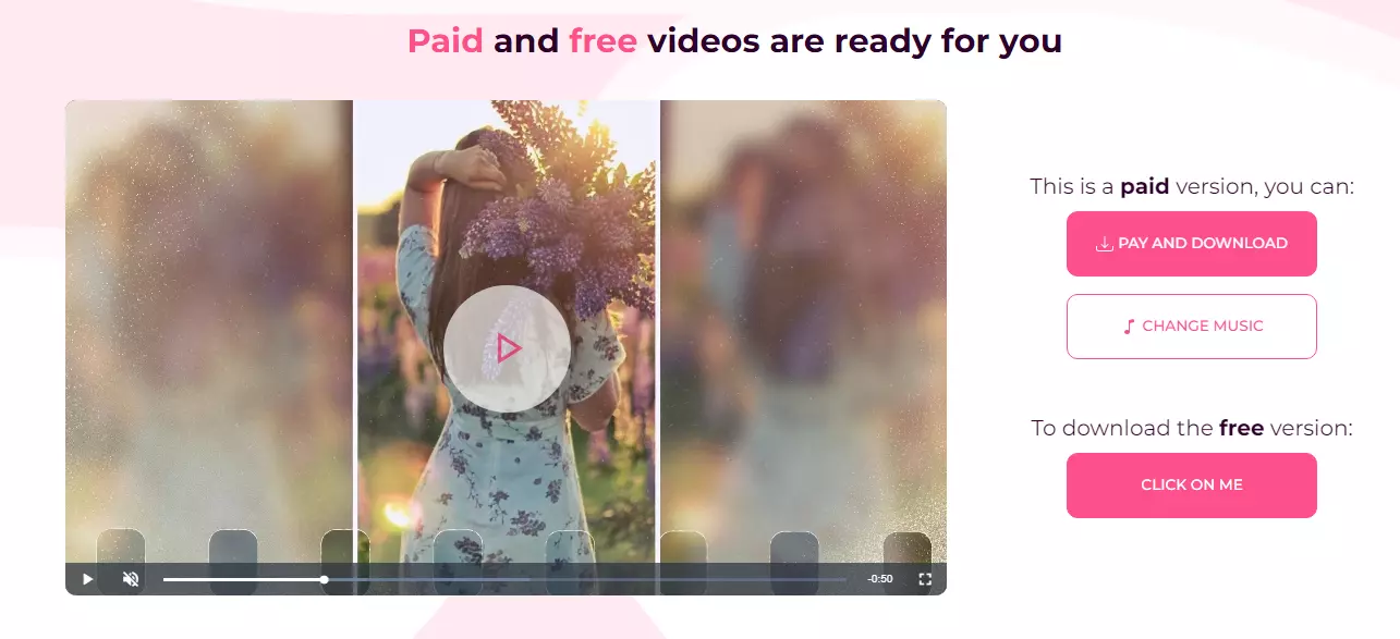 If you created a present for an important event, choose the paid version. You also have the option to download a free one (with simpler effects) pressing “click me”. You have an opportunity to replace the music (or upload your own). That’s all. Your beautiful slideshow is downloading.