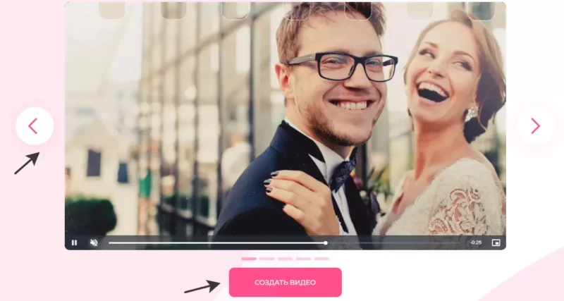 Для начала подберите дизайн, который Вам больше понравится. Нажимайте на стрелки, включите музыку. После того, как определились с дизайном, нажимайте на кнопку «Создать видео».
