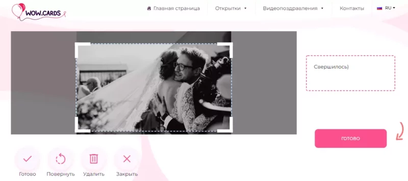 При желании добавьте свой текст, нажимая на любое загруженное фото. Жмите “готово”. Обратите внимание, что у вас есть возможность обрезать, повернуть или удалить фото – легко и просто.