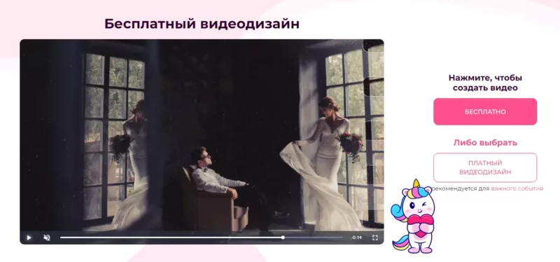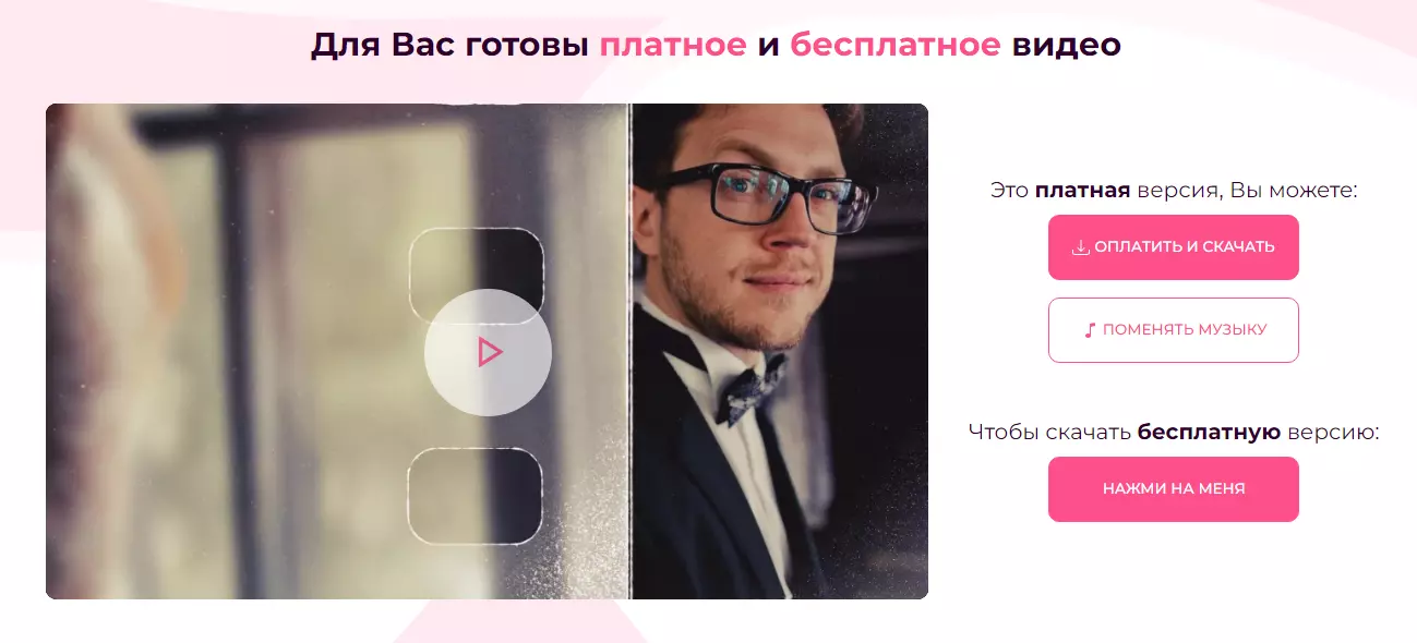 Если у Вас важное событие и можете позволить оплату, выбирайте платную версию. Хотите скачать бесплатную (с более простыми эффектами)? Вас ждет кнопка “нажми на меня”. При желании можете заменить музыку (либо загрузить свою). Вот и всё. Ваше прекрасное видео скачивается.